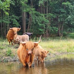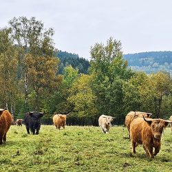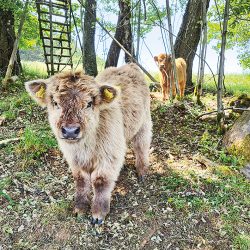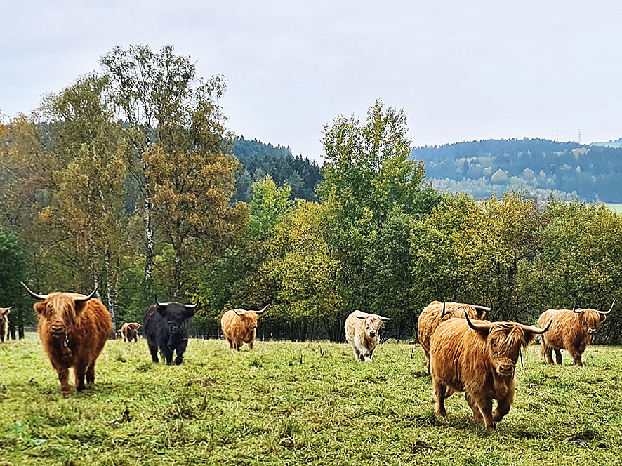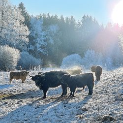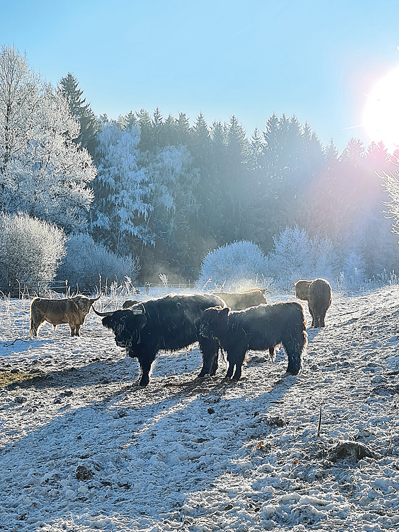 Das Highland-Cattle ist ein beeindruckendes Rind, das für sein langes Fell und seine prächtigen Hörner bekannt ist. Das dichte Haarkleid schützt sowohl im Sommer bei großer Hitze als auch im Winter, bei rauem Wetter; selbst Schnee und Temperaturen bis -20 °C sind kein Problem. So ist diese Rasse für ganzjährige Weidehaltung bestens geeignet. Sie sind tolle Landschaftspfleger und tragen zum Erhalt und zur Förderung der Artenvielfalt bei.