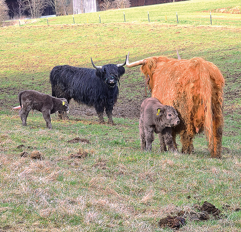 Die Zottel-Kühe bringen ihre Kälber im Herdenverbund zur Welt. Die Kälber werden auf natürliche Weise gesäugt und wachsen in der Familie auf.